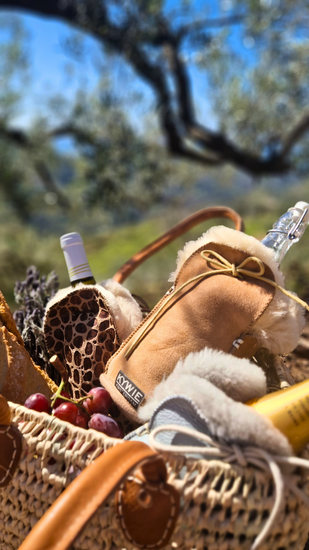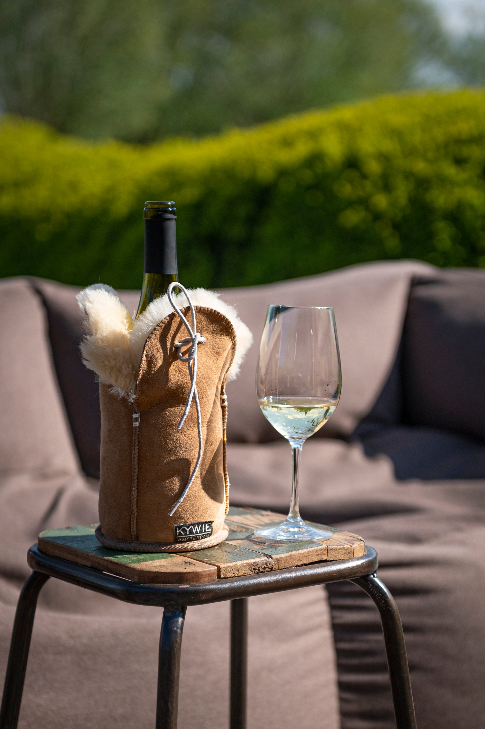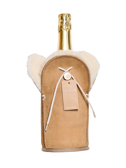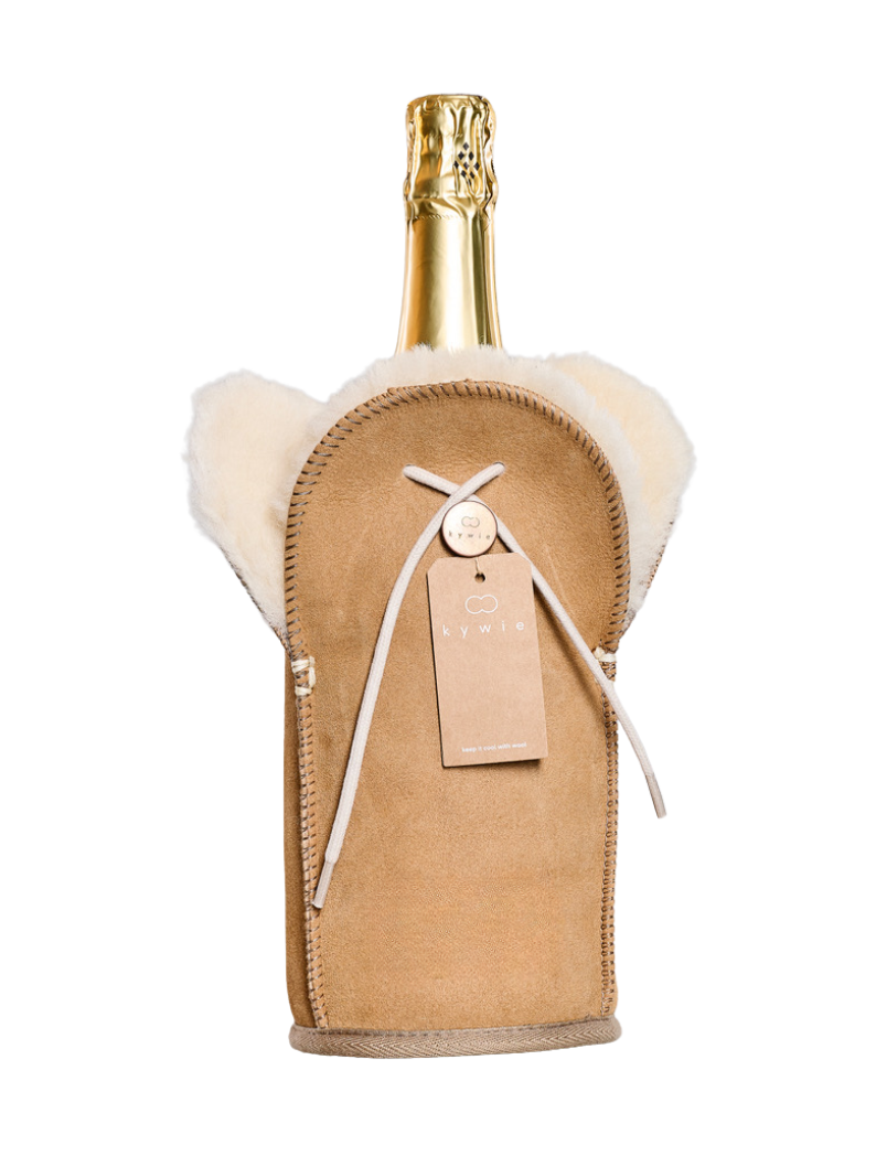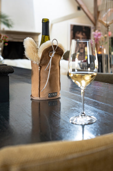 Der Weinkühler KYWIE besteht zu 100 % aus natürlichem Schaffell. So intuitiv es auch sein mag, dieser Kühler hält kühl!