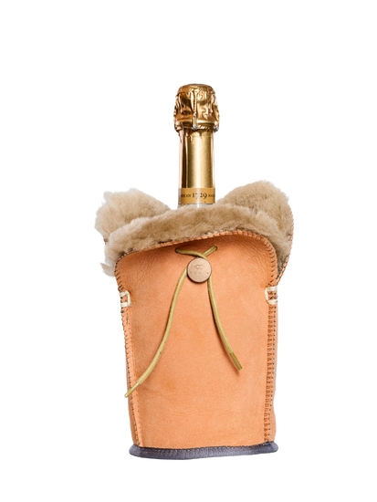 kywie XL champagne cooler is a sheepskin tote that keeps pre-chilled extra wide bottles such as Ruinart cool. The natural insulating properties of wool will preserve the temperature of Champagnes well after the bottle is emptied. Pre-chilled champagne at the desired temperature for 4 hours! This unique natural passive cooler uses the inherent bio-insulation properties of sheep skin.