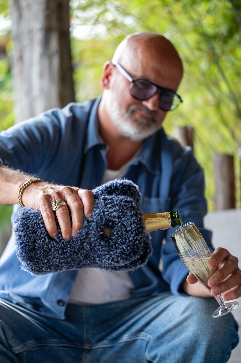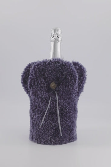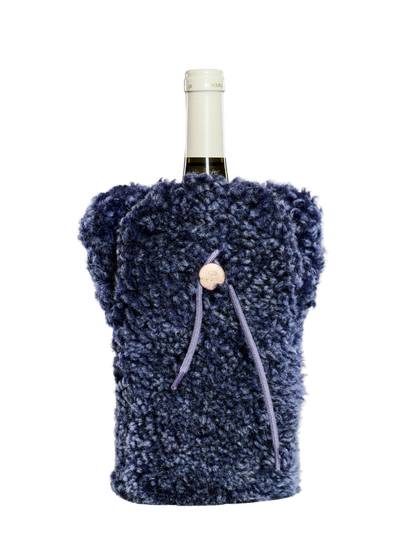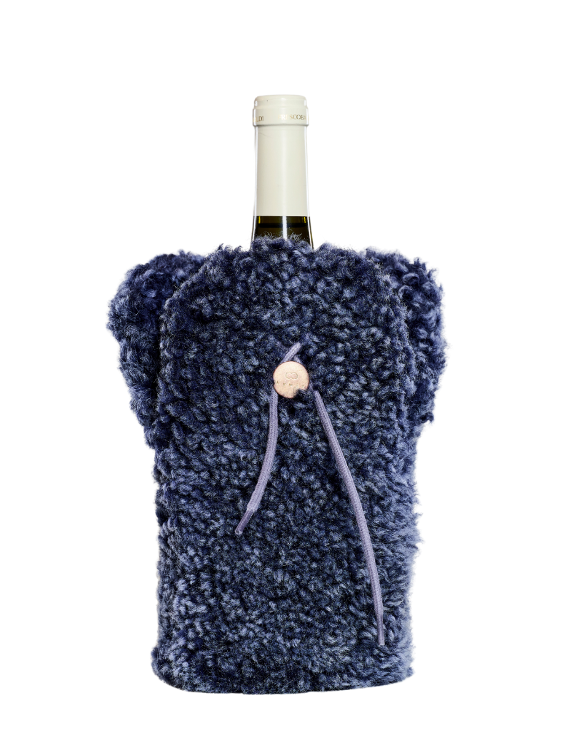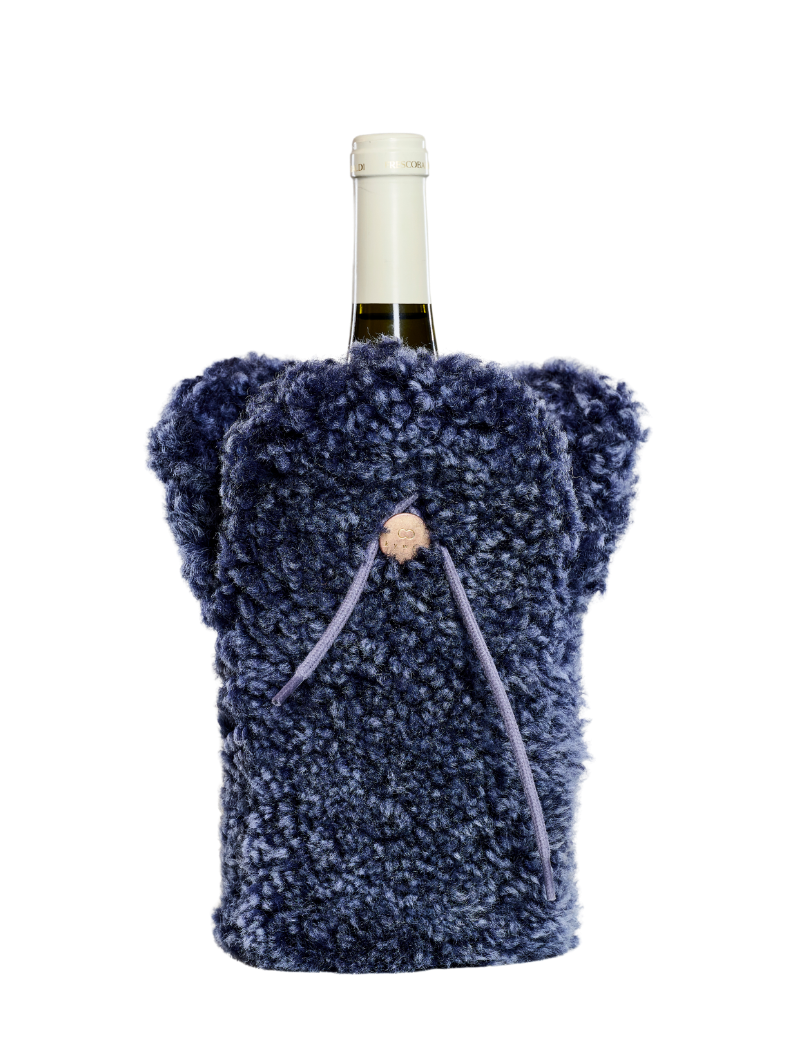 kywie Champagne cooler blue curly is an ingenious tote handcrafted from 100% natural sheepskin that keep your pre-chilled Champagne, Burgundy, sparkling wine, Ciders and Spirits perfectly cold, even hours after you’ve opened the bottle. Thanks to the remarkable bio-insulating properties of wool and the airlock cord around the bottle’s neck, you can savor every sip at the ideal temperature.