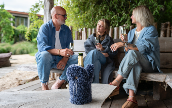 Discover the kywie Passive Champagne Cooler, handcrafted from 100% natural sheepskin. Its exceptional wool insulation and airlock cord keep your Champagne, Burgundy, sparkling wine, cider, and spirits chilled for hours. A unique gift, a functional eye-catcher on any table.