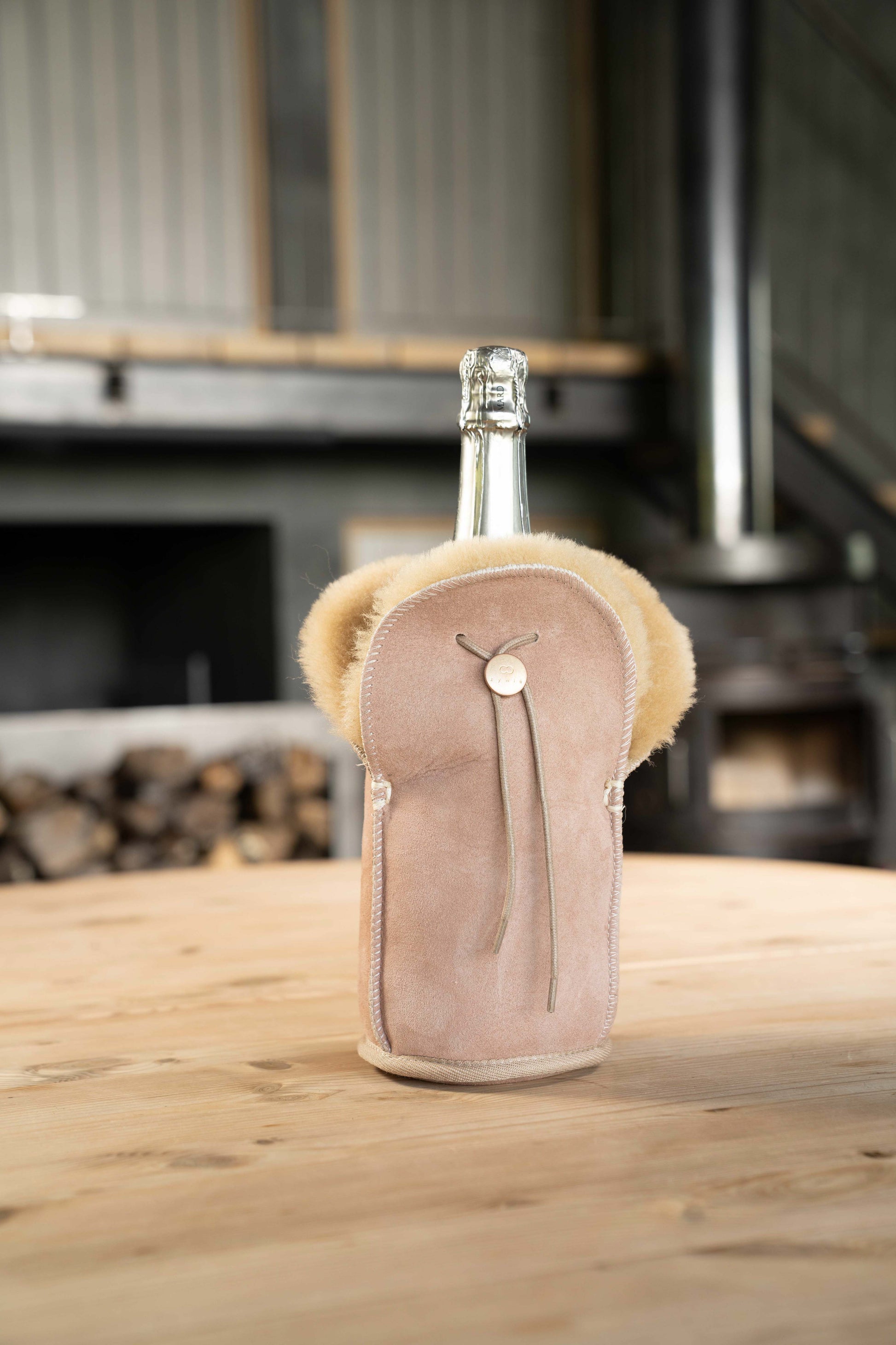 Discover the KYWIE Passive Champagne Cooler, handcrafted from 100% natural sheepskin. Its exceptional wool insulation and airlock cord keep your Champagne, Burgundy, sparkling wine, cider, and spirits chilled for hours. A unique gift, a functional eye-catcher on any table.