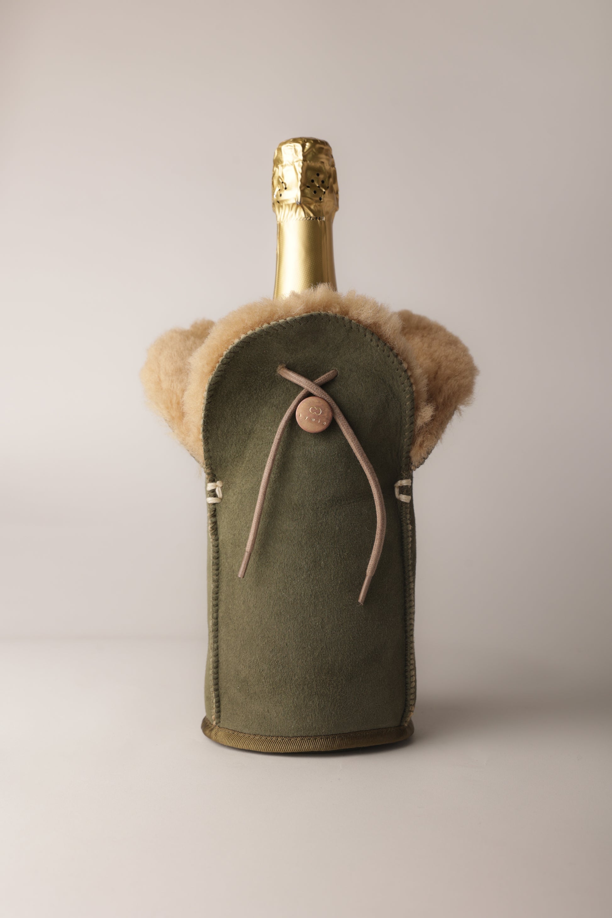 Discover the KYWIE Passive Champagne Cooler, handcrafted from 100% natural sheepskin. Its exceptional wool insulation and airlock cord keep your Champagne, Burgundy, sparkling wine, cider, and spirits chilled for hours. A unique gift, a functional eye-catcher on any table.