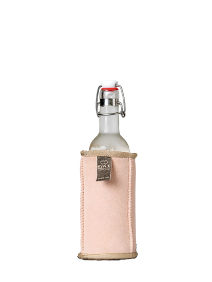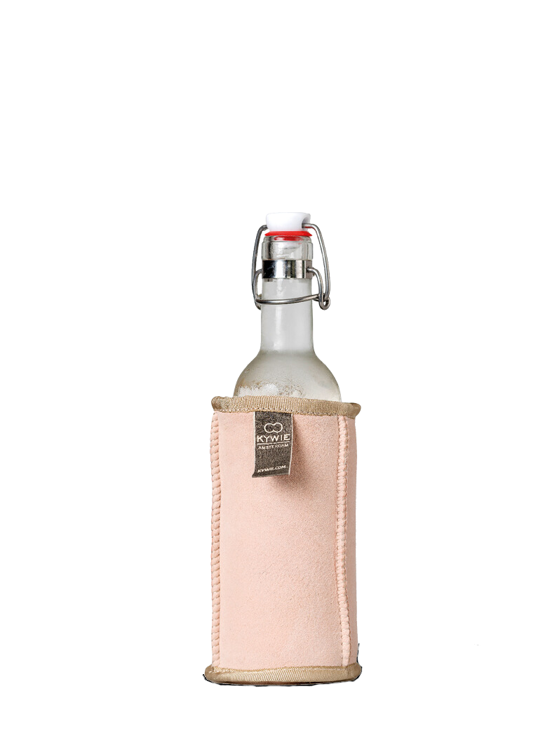 KYWIE Demi cooler is a sheepskin tote that fits 500ml water bottles, beer bottles, long cans and drinking glasses. It is a smaller version of the Kywie wine cooler and comes with a bottom (if you are looking for a bottomless sleeve for your cans, you will want a KYWIE Keyring) . It will keep 50cl glass (or plastic) water bottles at even temperature and well protected.