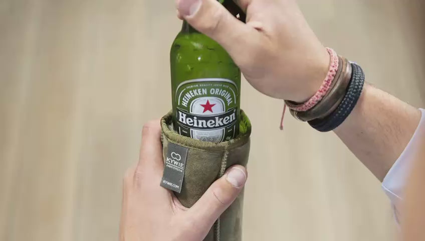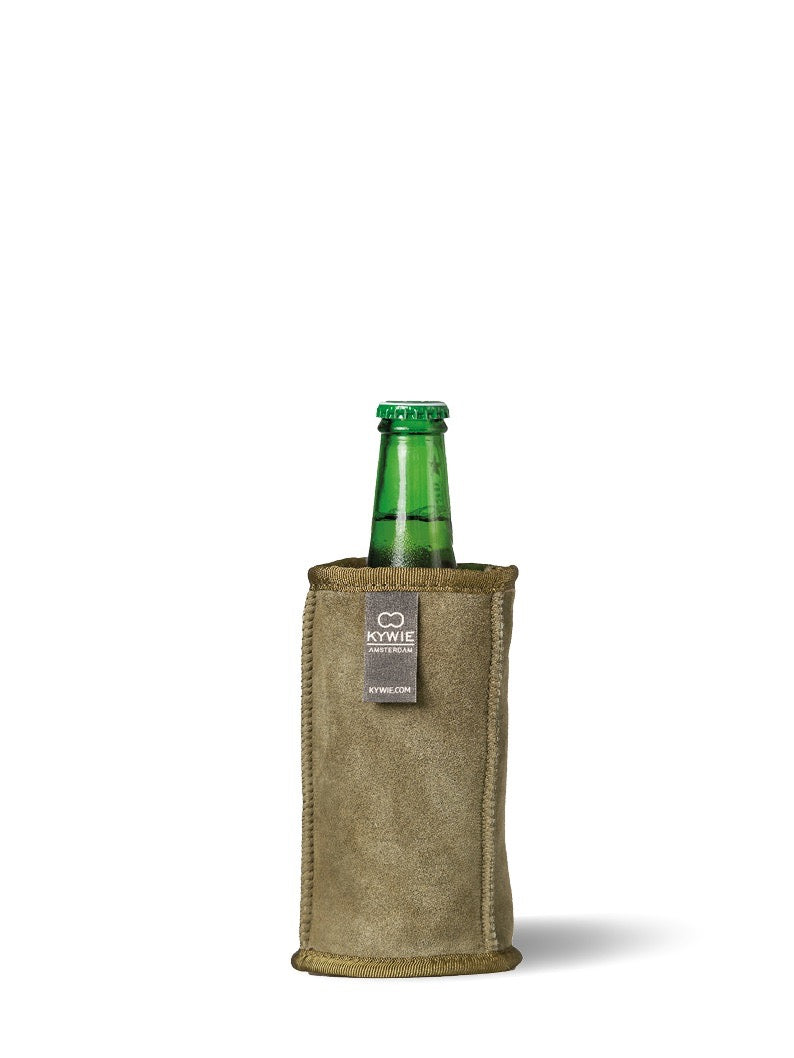 kywie demi cooler is a sheepskin tote that fits 500ml water bottles, beer bottles, long cans and drinking glasses. It is a smaller version of the kywie wine cooler and comes with a bottom (if you are looking for a bottomless sleeve for your cans, you will want a kywie Keyring) . It will keep 50cl glass (or plastic) water bottles at even temperature and well protected.