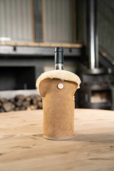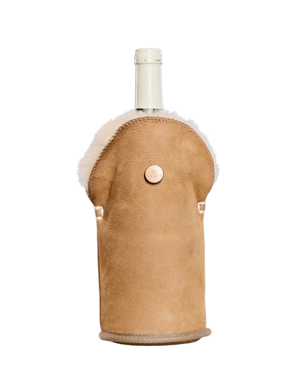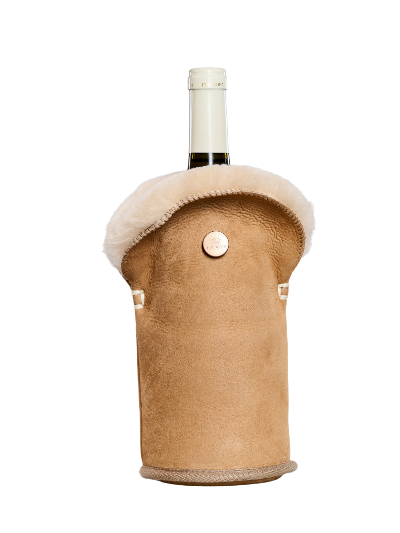 KYWIE wine cooler is made of 100% natural sheepskin. Counter intuitive as it may be, this cooler keeps cool!
