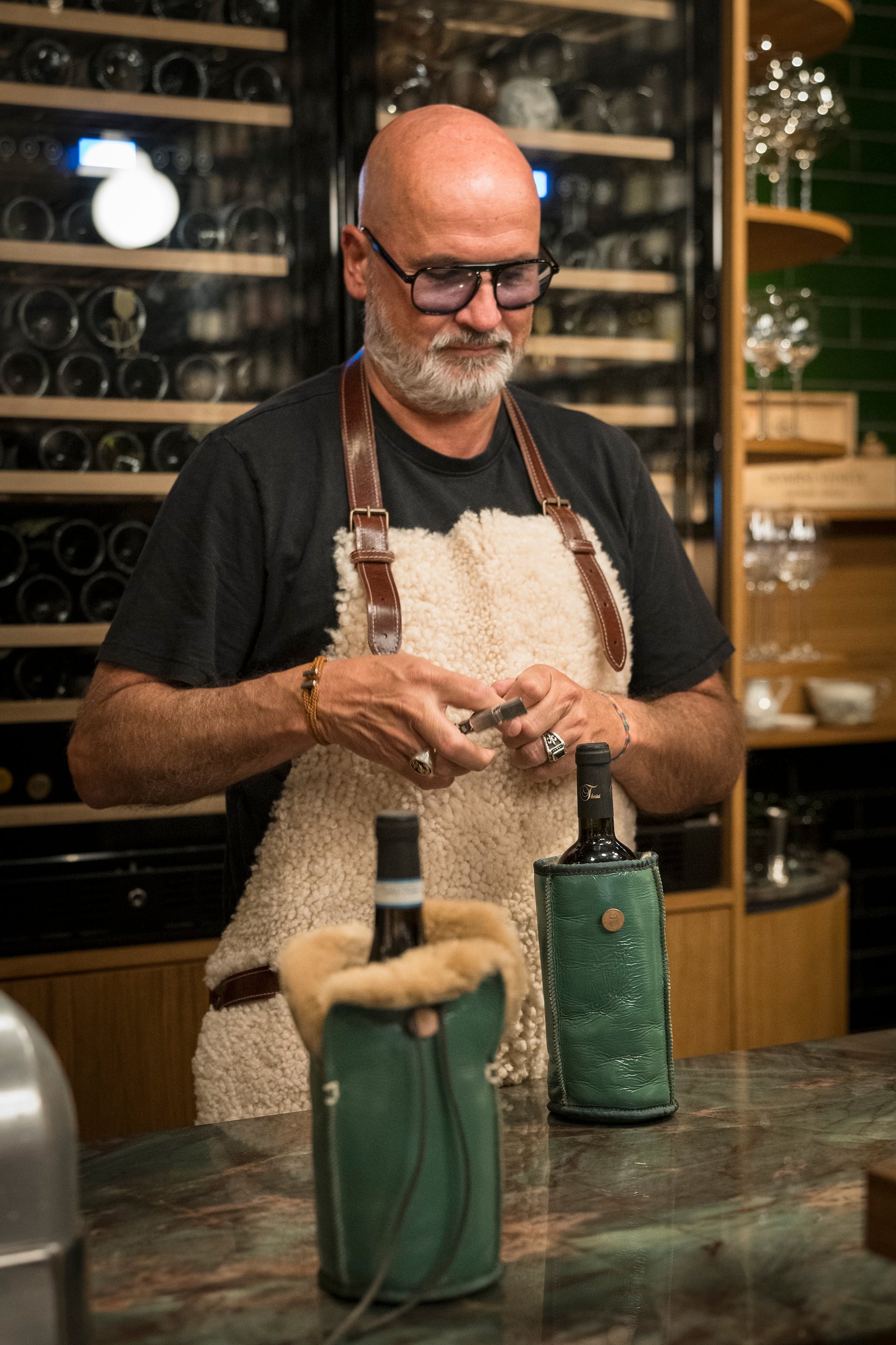 KYWIE wine cooler is made of 100% natural sheepskin. Counter intuitive as it may be, this cooler keeps cool!