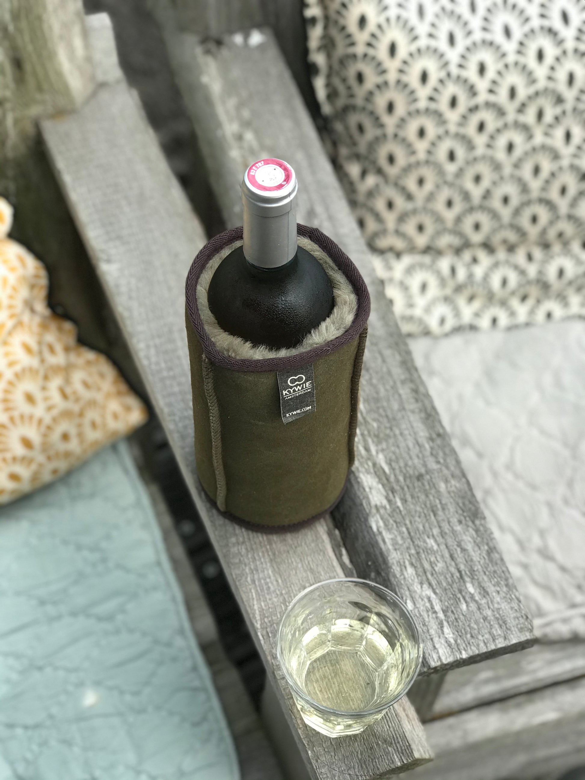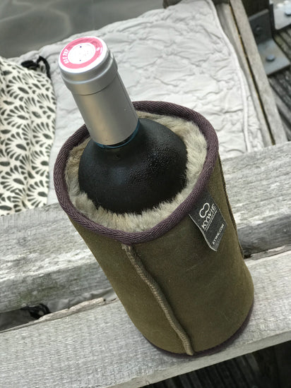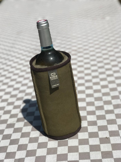 KYWIE wine cooler is made of 100% natural sheepskin. Counter intuitive as it may be, this cooler keeps cool!